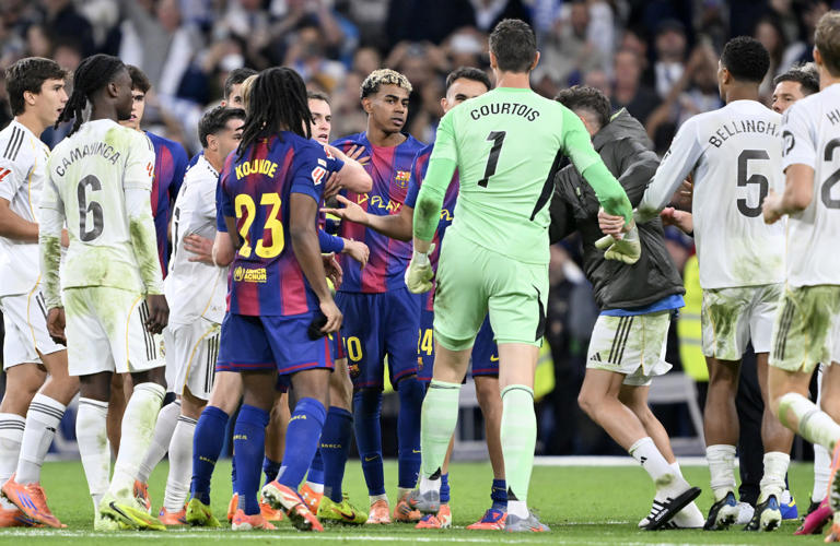 Real Madrid’s dramatic 2-1 victory over Barcelona at the Santiago Bernabeu descended into chaos when tensions boiled over in a mass brawl involving multiple players from both sides. The clash came after Barcelona’s Lamine Yamal made controversial pre-match comments criticizing Los Blancos’ conduct.