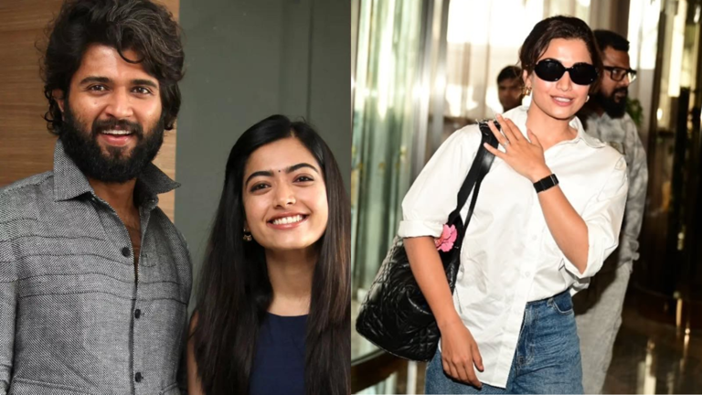 Rashmika Mandanna has once again set social media abuzz after being spotted wearing a distinctive ring at Dubai airport, reigniting speculation about her rumored relationship with Vijay Deverakonda. The viral photos and videos show the actress looking effortlessly chic in a white shirt, blue jeans, and black sunglasses, but it was the mysterious ring that caught everyone’s attention.