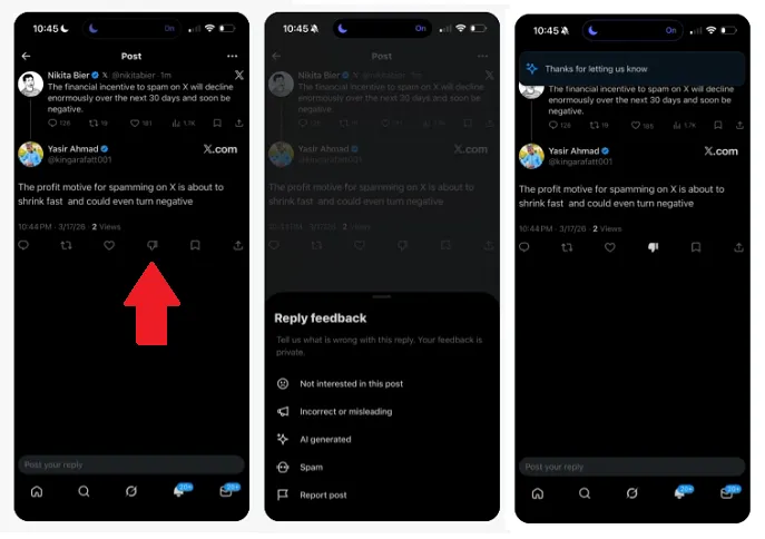 X is rolling out comment downvotes once again, this time with a clearer purpose: fixing what the platform’s own head of product called the worst feature on the site. Nikita Bier announced the test on Wednesday, revealing a new thumbs-down icon appearing on post replies. Users who tap it can select from five reasons — including spam, misleading content, and AI-generated posts — giving X richer data to sort its reply feed.