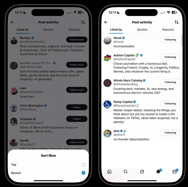 The sorting functionality can be accessed through the “View Activity” option at the bottom right of an expanded post display. Users can tap on the “Liked by” listing and select a new up/down arrow icon to sort likes by “Top” or “Recent.” According to X’s head of product Nikita Bier, the “Top” option prioritizes likes from mutual follows, followed by prominent accounts with larger audiences.