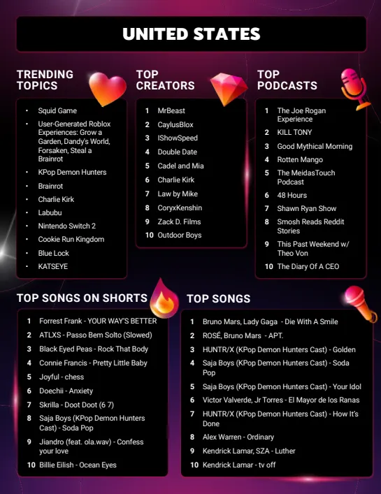 The platform’s Culture and Trends team identified several trending topics that saw above-average growth throughout the year, including Squid Game, K-Pop, Demon Hunters, and Labubu. YouTube’s inclusion of podcasts in trend rankings reflects the medium’s growing importance on the platform, with visual accompaniment driving significant audience growth.
